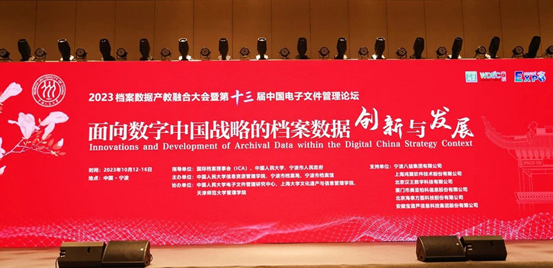 10月14日,由國際檔案理事會、中國人民大學(xué)、寧波市人民政府指導(dǎo),中國人民大學(xué)信息資源管理學(xué)院、寧波市檔案局和寧波市檔案館聯(lián)合主辦的2023檔案數(shù)據(jù)產(chǎn)教融合大會暨第十三屆中國電子文件管理論壇開幕式在浙江寧波成功舉辦。本次會議以“面向數(shù)字中國戰(zhàn)略的檔案數(shù)據(jù)創(chuàng)新與發(fā)展”為主題。來自黨政機(jī)關(guān)、企事業(yè)單位、高等院校、科研院所、檔案信息技術(shù)公司的約500位專家學(xué)者、嘉賓代表相聚甬城,分享檔案數(shù)據(jù)治理和管理的最新理論見解和一線實(shí)踐經(jīng)驗(yàn),共商檔案數(shù)據(jù)產(chǎn)教融合的路徑和方法,展望檔案事業(yè)現(xiàn)代化的圖景,漢王數(shù)字全程深度參與本屆大會及論壇的各項(xiàng)活動。